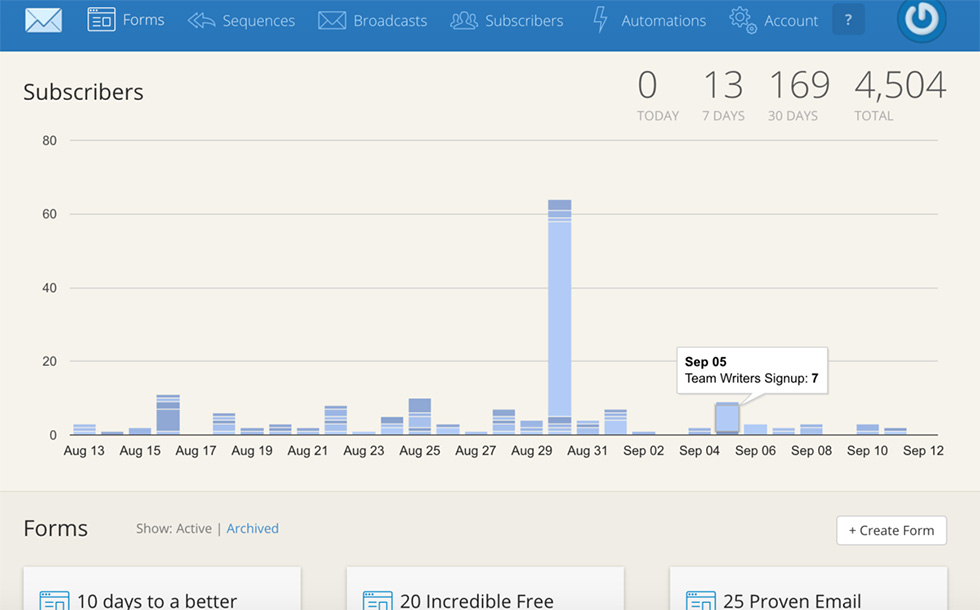 این بازاریابی ایمیلی که وبلاگنویسان آن را ساختهاند، برنامه منتخب و برتر آنهاست. اخیراً من از MailChimp استفاده کردهام و تعداد کلیکهای من از 5/0 درصد به 2.5 درصد، افزایش یافتهاند. افزایش چشمگیر 200 درصدی کلیکهایم، دستاورد خوبی است. Pat Flynn ،Copyackers (Joanna Wiebe) ، تنها تعداد کمی از کاربران ConvertKit هستند.